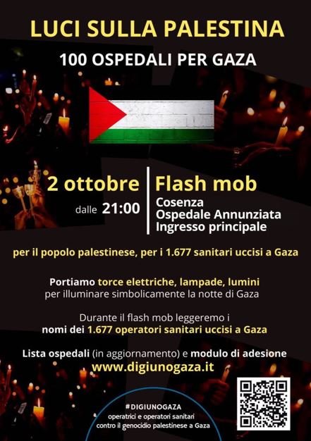 “Luci sulla Palestina – 100 ospedali per Gaza”: anche a Cosenza ci sarà il flash mob promosso in tutto il Paese dalla rete delle operatrici e degli operatori sanitari #DigiunoGaza; una mobilitazione che simbolicamente unisce da nord a sud l’intera penisola con il coinvolgimento di 100 ospedali per esprimere solidarietà al popolo palestinese, condannare il genocidio in corso e ricordare i 1.677 sanitari uccisi a Gaza.