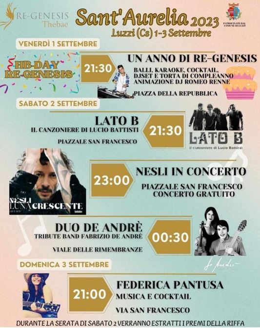 Sabato 2 settembre la serata si prospetta ricca di sorprese e soprattutto di tanta tanta buona musica. Presso piazzale San Francesco salirà sul palco in prima serata, a partire dalle ore 21, la band” Lato B”, che darà il via all’atteso concerto di Santa Aurelia proponendo i brani più famosi di Lucio Battisti e che farà da apripista all’esibizione in esclusiva provinciale di NESLI; il noto rapper dal flow riflessivo, cantautore, nonché autore e produttore di molti dei brani del fratello Fabri Fibra, Emma Marrone ecc. ecc. si esibirà in esclusiva a Luzzi intorno alle 23.00.
