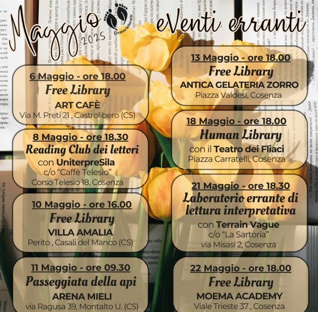 Oltre alle Free Library, gli altri eventi di maggio proseguono giovedì 8 maggio con l’incontro del Reading Club dei lettori presso il Caffè Telesio, in collaborazione con UniterpreSila, per discutere del romanzo “La casa degli sguardi” di Daniele Mencarelli, in un momento di confronto tra lettori.