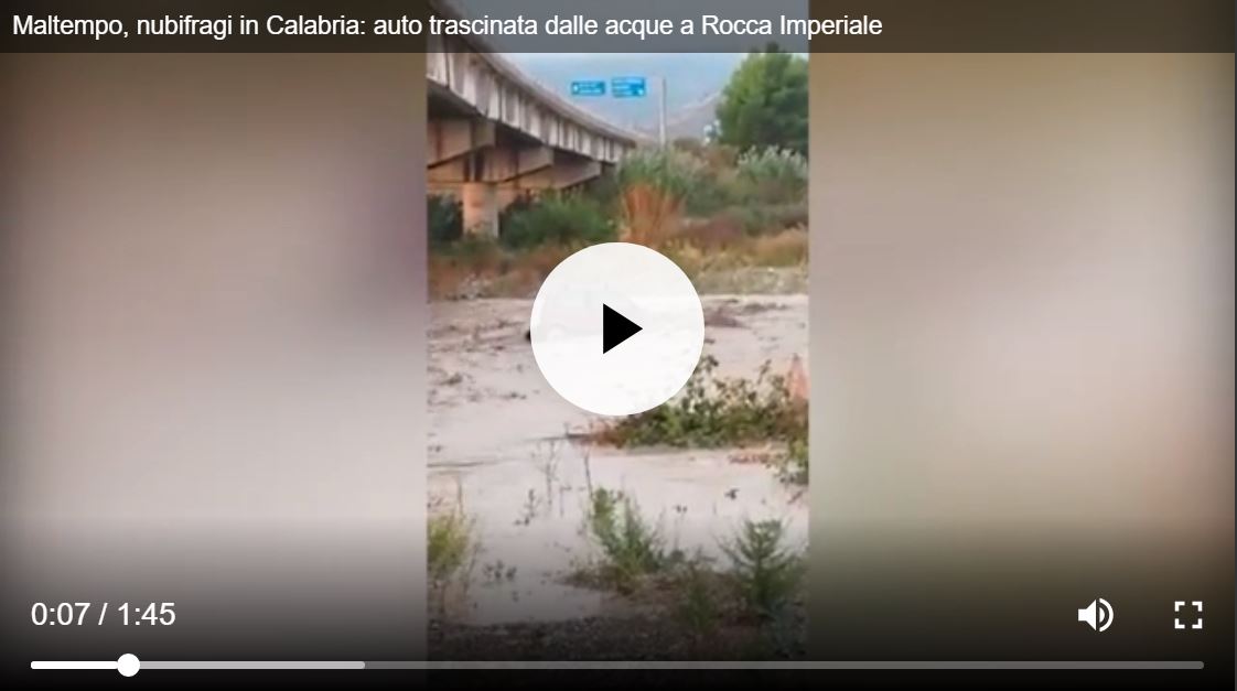 “Violenta ondata di maltempo sulla Calabria. Le immagini condivise sui social network dagli abitanti di Rocca Imperiale, comune in provincia di Cosenza mostrano un’auto trascinata dalle forze delle acque in un torrente.”