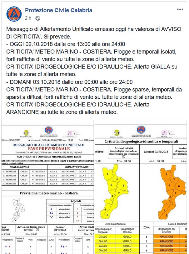Ecco il bollettino diffuso poco fa dalla Protezione Civile Calabria: