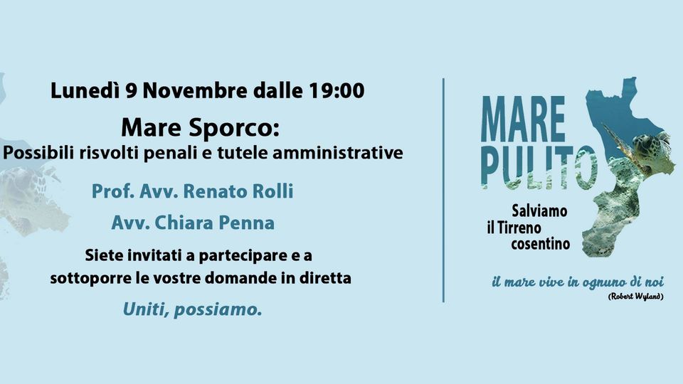 Lunedì 9 Novembre dalle ore 19:00 una conferenza virtuale sulla tematica del mare sporco da un punto di vista giuridico