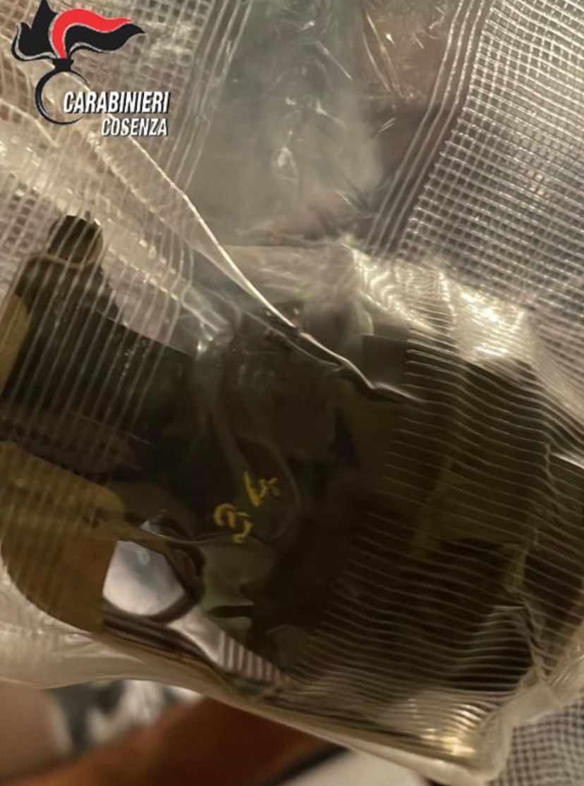 “I Carabinieri hanno arrestato in flagranza di reato due coniugi di Mendicino, in quanto trasportavano, a bordo della loro autovettura, 1,5 kg di hashish, suddivisi in 15 panetti e 3,5 kg di marijuana essiccata. Nella successiva perquisizione dell’abitazione è stata trovata anche una bomba a mano M-75, tipo “ananas”, completa di innesco.”