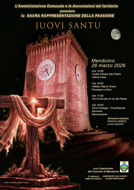 Mendicino si prepara a rinnovare una delle sue tradizioni più antiche e identitarie: la Sacra Rappresentazione della Passione, conosciuta anche come “Juovi Santu”, in programma sabato 28 marzo 2026 a partire dalle ore 14:30.