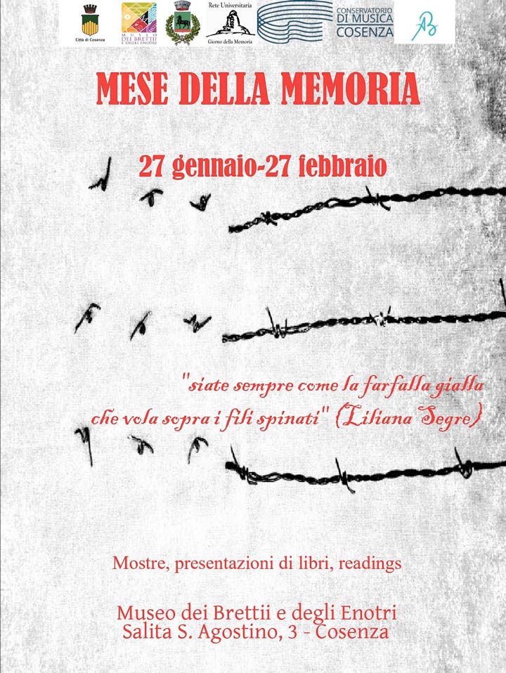 Estremamente importante la collaborazione, con il Comune e il Museo dei Brettii e degli Enotri, della Rete Universitaria per il Giorno della Memoria, nella persona della referente regionale Alessandra Carelli, storica dell’arte e da molti anni attiva sul territorio in molteplici iniziative volte al contrasto del fenomeno delle disuguaglianze, dell’illegalità, dei razzismi, dei nuovi fascismi e di ogni forma di odio. Alle iniziative promosse da Palazzo dei Bruzi, partecipano anche il Comune di Tarsia – nel cui territorio, a Ferramonti, ha sede il più grande campo di concentramento fascista italiano, il Conservatorio “Stanislao Giacomantonio” di Cosenza e la Scuola di Recitazione Cinematografica “Arti Blu”.