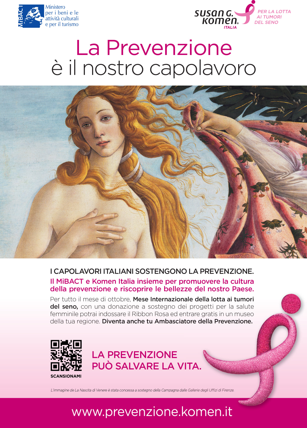 “Il Ministero per i Beni e le Attività Culturali e per il Turismo ha deciso di sostenere ancora Komen Italia con una campagna congiunta per promuovere la cultura della prevenzione e riscoprire le bellezze del nostro Paese.