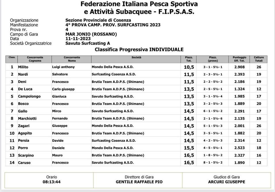 Ad aggiudicarsi il titolo di campione quest’anno è Milito Luigi Anthony che oltre al titolo stacca il pass diretto per il campionato italiano di specialità 2024, secondo e qualificazione diretta anche per Nardi Salvatore dell’ a.s.d. Surfcasting Cosenza, ultimo del podio ma con un risultato eccellente la promessa del Surfcasting calabrese, il giovanissimo Deni Francesco militante tra le file della Brutia team.”