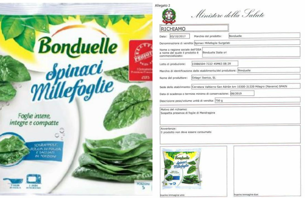 “Milano, 4 ottobre 2017 – Il ministero della Salute ha pubblicato un richiamo per il ritiro dai supermercati di un lotto di spinaci millefoglie surgelati Bonduelle per “sospetta presenza di foglie di mandragora”. Il prodotto, si legge nel richiamo, “non deve essere consumato”. I carabinieri della Sanità Nas stanno provvedendo al ritiro del lotto ancora sul mercato. Il richiamo è a livello nazionale e si riferisce al lotto 15986504-7222 45M63, con data di scadenza 8/2019, confezione da 750 grammi.”