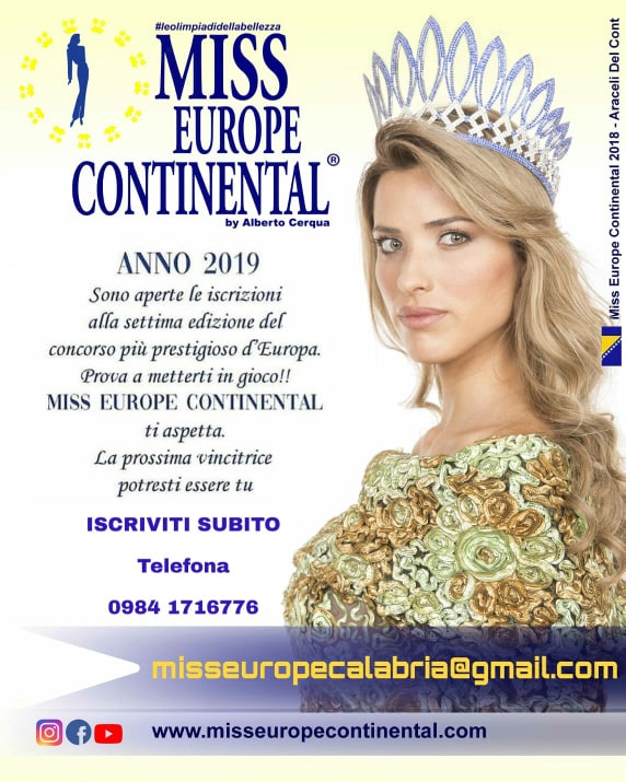 IL CASTING PER ISCRIZIONE UFFICIALE DELLE RAGAZZE PARTECIPANTI A “Miss Europe Continental”, si terrà su Cosenza in location e giorno da stabilire tra il 28 ed il 30 di luglio.