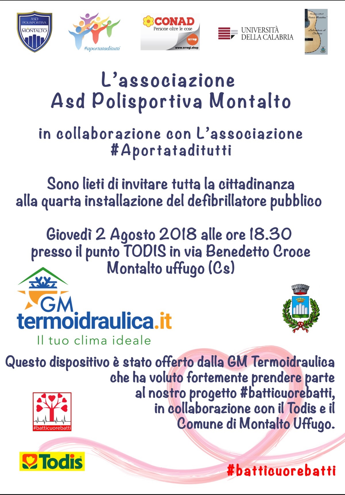 Con orgoglio ed un pizzico di emozione informiamo tutti che giovedi 2.8.2018 alle ore 18.30 presso il punto Todis di Montalto Uffugo Scalo installeremo il 4° defibrillatore pubblico.