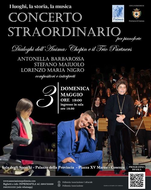 Un appuntamento di grande valore artistico e culturale che trasformerà la musica in esperienza interiore, con un programma costruito come un racconto sonoro continuo. L’Associazione culturale Polimnia, con il patrocinio della Provincia di Cosenza, presenta il Concerto Straordinario che continua la rassegna “I luoghi, la storia, la musica”.