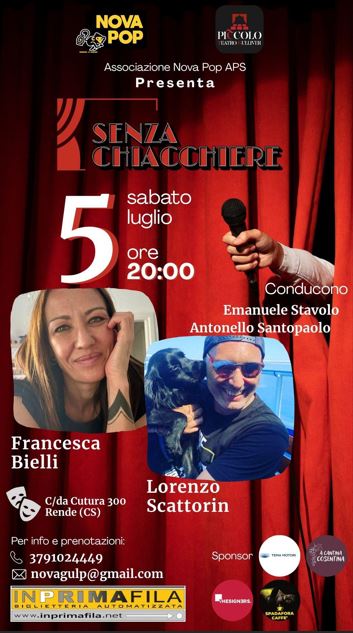A condurre la serata saranno Emanuele Stavolo e Antonello Santopaolo, entrambi membri fondatori dell’Associazione Nova Pop, che guideranno il pubblico in un vero e proprio viaggio attraverso la voce, l’emozione e la narrazione. Non si limiteranno a condurre, ma creeranno uno spazio autentico di confronto e ascolto, dando forma a un dialogo sincero e coinvolgente con gli ospiti. Il tutto senza filtri, senza sovrastrutture e, come suggerisce il titolo stesso, “senza chiacchiere”: soltanto storie vere, esperienze vissute e passioni condivise con il pubblico in sala.