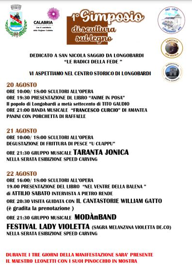 Nei giorni 20, 21 e 22 agosto, Longobardi sarà centro di grande interesse culturale ed artistico grazie al confronto tra artisti scultori impegnati attivamente nel I Simposio di Scultura sul Legno, dedicato a San Nicola Saggio da Longobardi e dal tema “Le radici della fede”