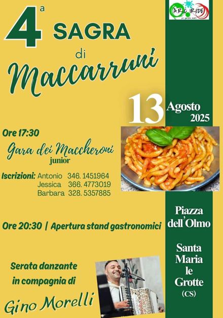 Mercoledì 13 agosto 2025, nel cuore del piccolo e affascinante borgo di Santa Maria le Grotte (CS), la tradizionale Sagra dei Maccheroni organizzata dall’Associazione Ricreativa Culturale Iride