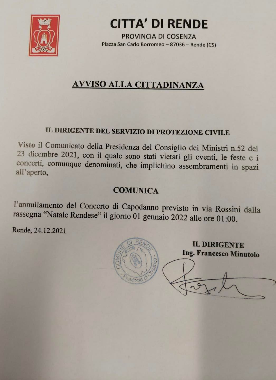 “Annullato ufficialmente il concerto di Capodanno di Aiello a Rende. Il Comune dà così seguito al Decreto festività, che introduce il divieto di eventi all’aperto fino a tutto il 31 dicembre per contenere la nuova ondata di contagi da Covid.”