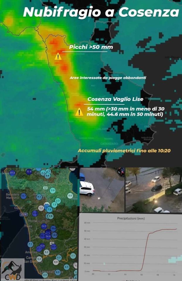 È il caso del temporale di stamane! Come si evince dalla mappa radar che rappresenta le cumulate più elevate, Cosenza ricade proprio nelle aree dove le precipitazioni sono state davvero abbondanti. In dettaglio, la stazione meteorologica di Cosenza Vaglio Lise (ricordo a norma OMM, ed installata in uno spazio completamente aperto senza alcun tipo di ostacolo che potrebbe influenzare le misurazioni) ha registrato 54 millimetri totali parziali fino alle ore 10.20 (dato ancora in crescita), di cui ben 44.6 mm sono caduti durante il temporale in 50 minuti, e 30 mm in meno di 30 minuti (da qui la classificazione del “Nubifragio”).