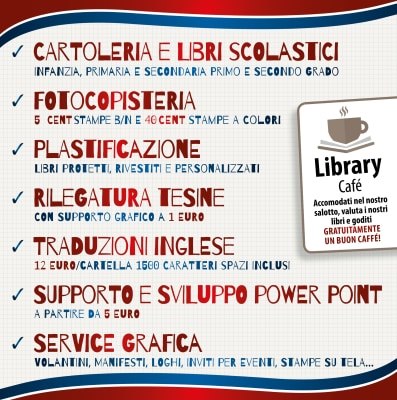 Oltre a fornire tutto il materiale e i testi scolastici delle scuole di ogni ordine e grado รจ possibile usufruire di una serie di servizi: fotocopisteria, plastificazioni, traduzione in lingua inglese, supporto Power Point, rilegatura tesine e grafica per stampe di tela, inviati personalizzati ecc.