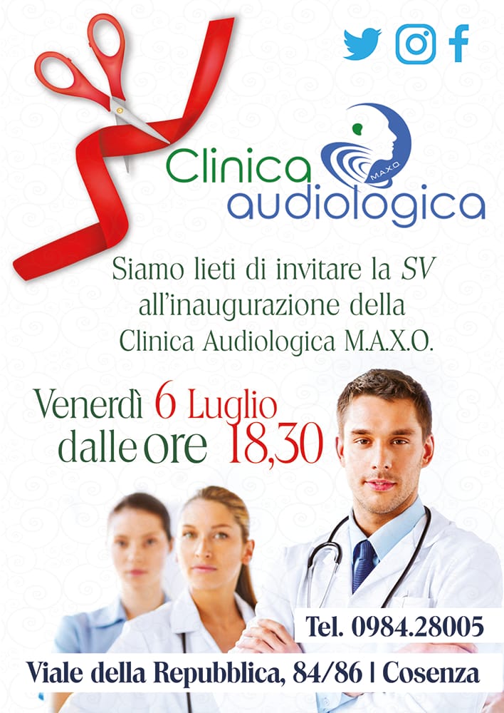 “Venerdì 6 luglio alle ore 18,30, nei locali rinnovati di Viale della Repubblica 84/86, verrà inaugurata la CLINICA AUDIOLOGICA per la cura e la prevenzione dei problemi dell’udito.