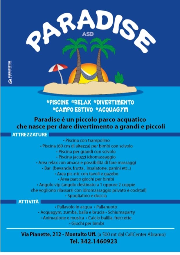 Il piccolo “Paradiso del divertimento”, creato, pensato e gestito da Carmelo Amodio ed Italo Montalto (entrambi di Montalto Uffugo) è situato, appunto, a Montalto Uffugo in Via Pianette, 212, (a 550 mt dal Call Center Abramo) …ed offre ai propri utenti i servizi di piscina, relax, divertimento, campo estivo ed acqua gym.
