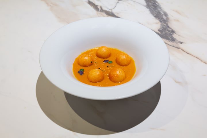 In un’atmosfera a metà tra mid century e space age, De Giuseppe propone una cucina che vuole essere un’esplorazione gastronomica.