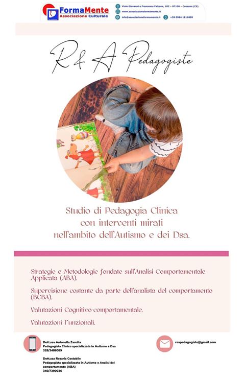 “R&A Pedagogiste” è uno studio di Pedagogia Clinica con interventi mirati nell’ambito dell’Autismo e dei DSA; Strategie e metodologie fondate sull’Analisi del Comportamento Applicata (ABA); Supervisione costante da parte di Analisti del Comportamento Certificati BCBA; Valutazione cognitivo comportamentale e Valutazioni funzionali.