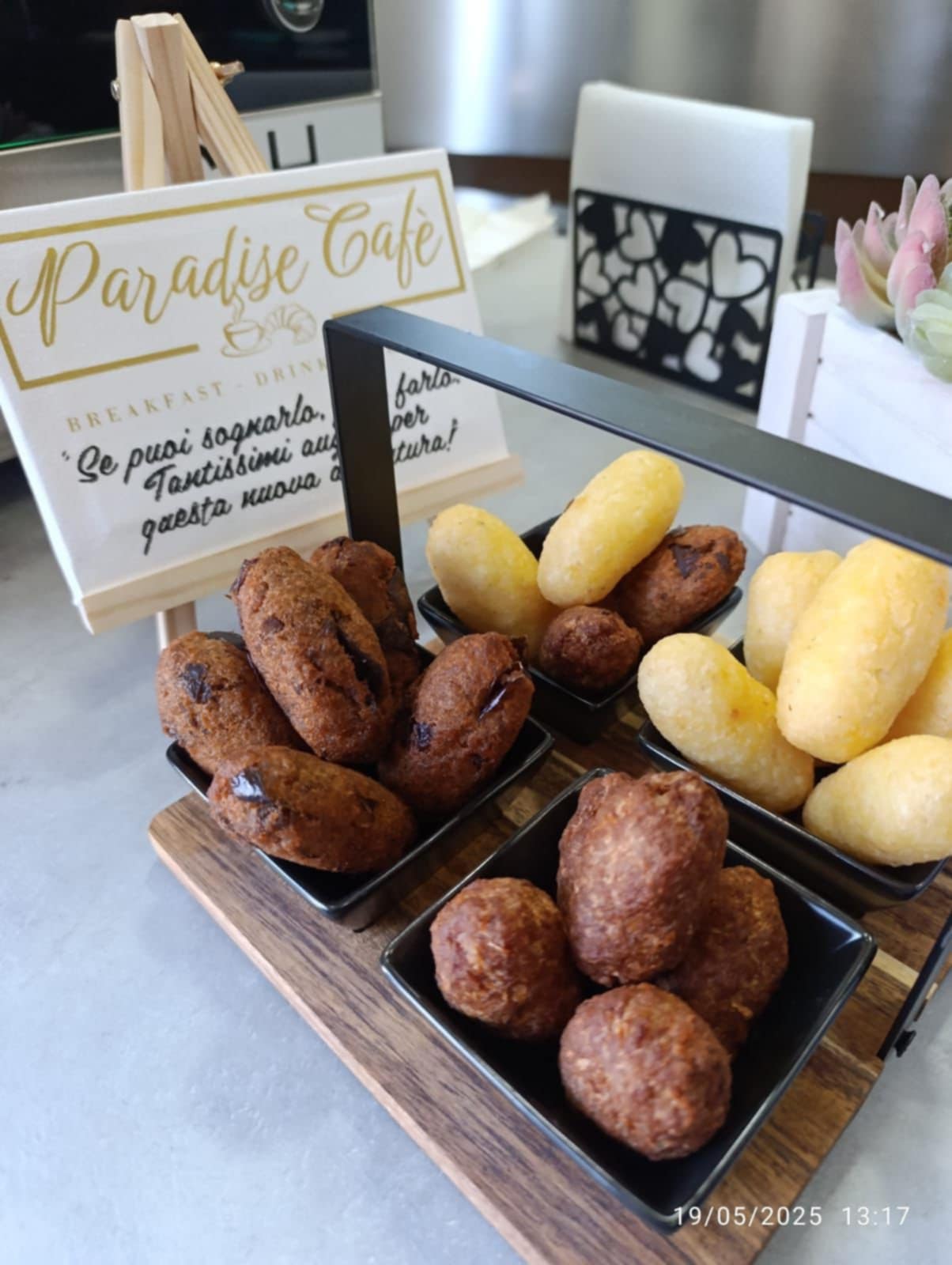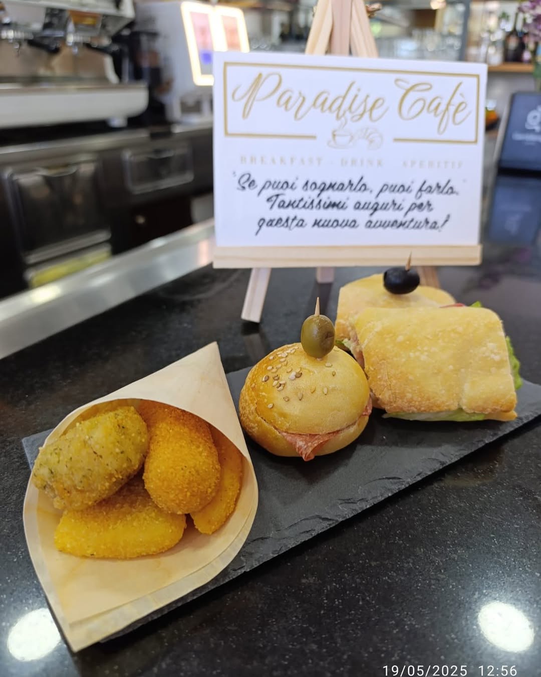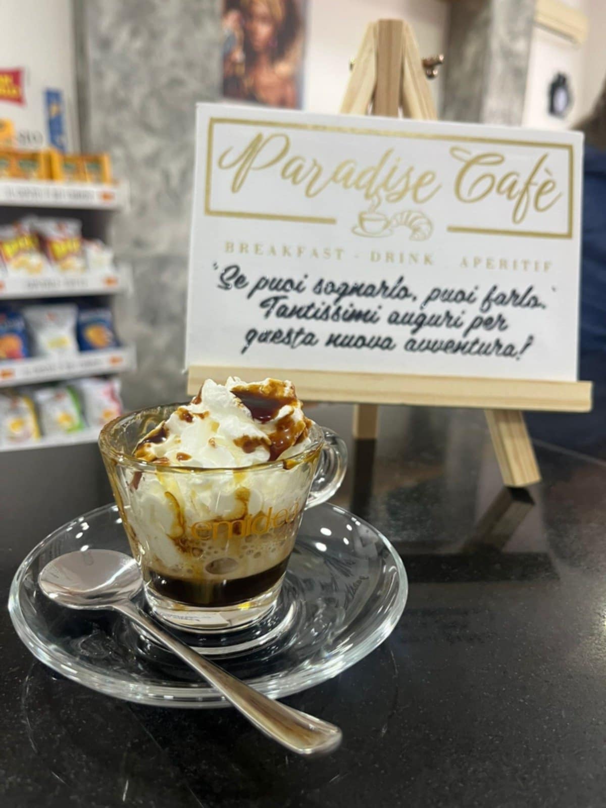 Il nome che ha voluto dare all’attività, chiamarlo bar è riduttivo, è “Paradise Cafè”, quasi a voler anticipare al cliente che sta entrando nel paradiso del gusto: dalla prima mattinata l’occhio e l’olfatto vengono colpiti dalla vista e dal profumo della pasticceria fresca tradizionale preparata per la prima colazione: cornetti, conchiglie, brioche e tante altre leccornie, senza dimenticare l’inebriante profumo del caffè. Prodotto prettamente locale e fra i più rinomati.