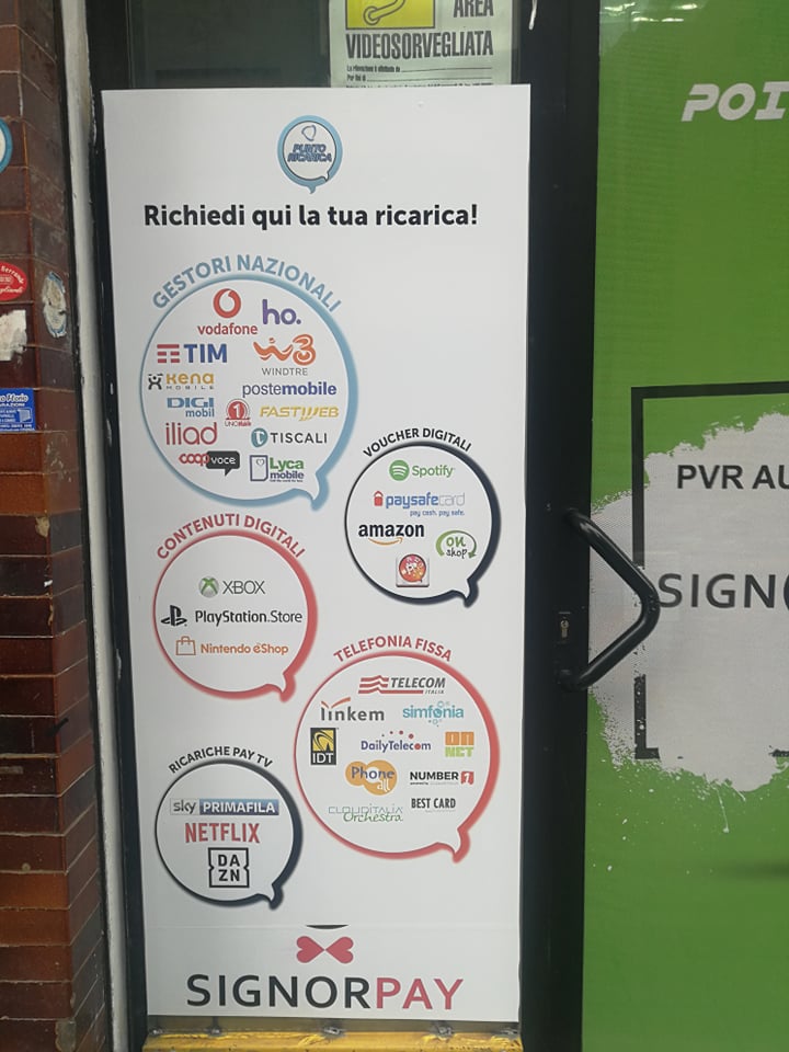 All’interno si offrono anche servizi vari di ricarica quali ad esempio di gestori telefonia mobile e fisso, gestori pay tv, ma anche contenuti e voucher digitali, aperture ricariche conti gioco.