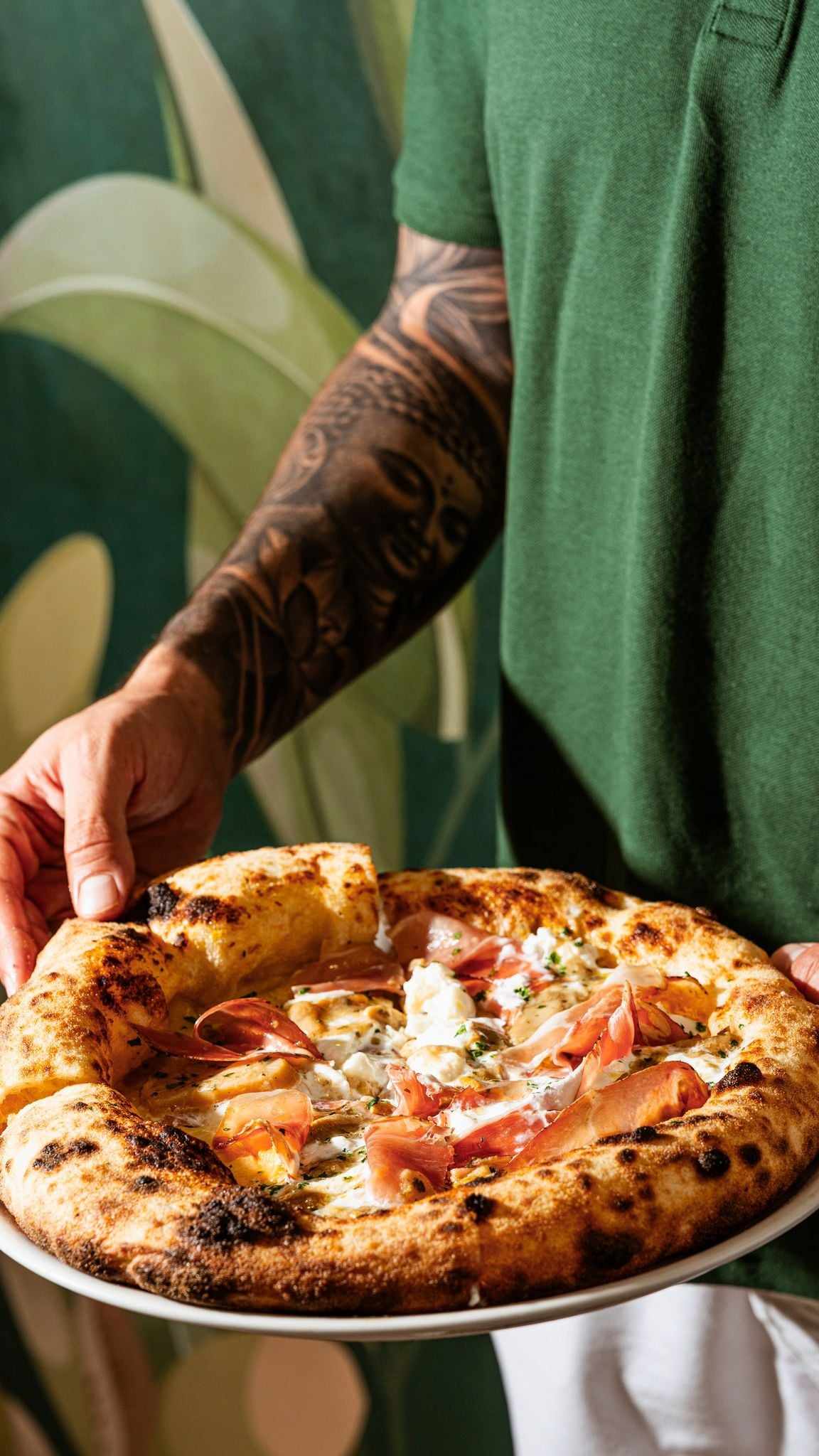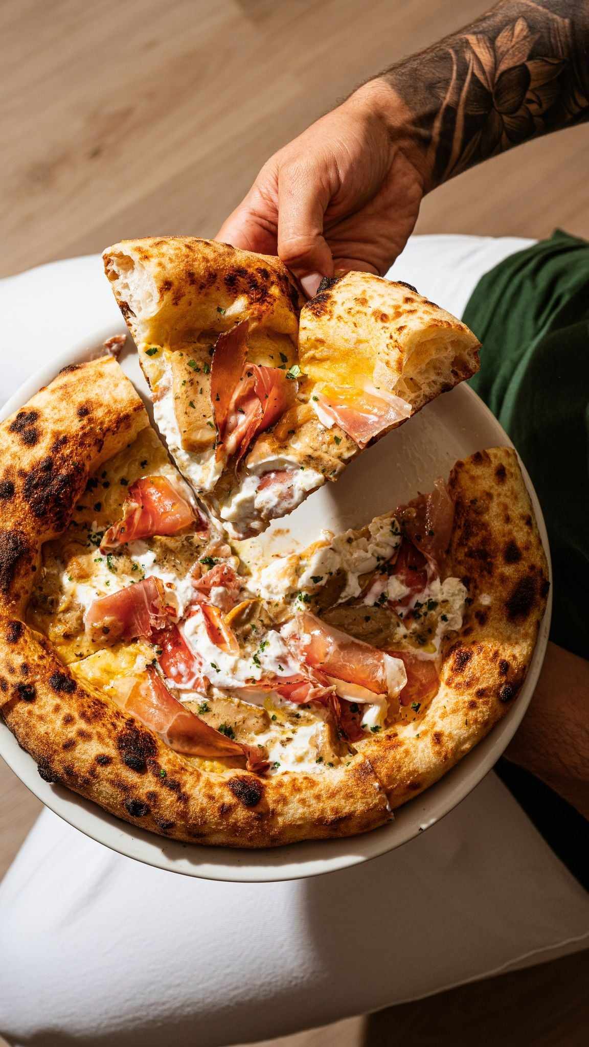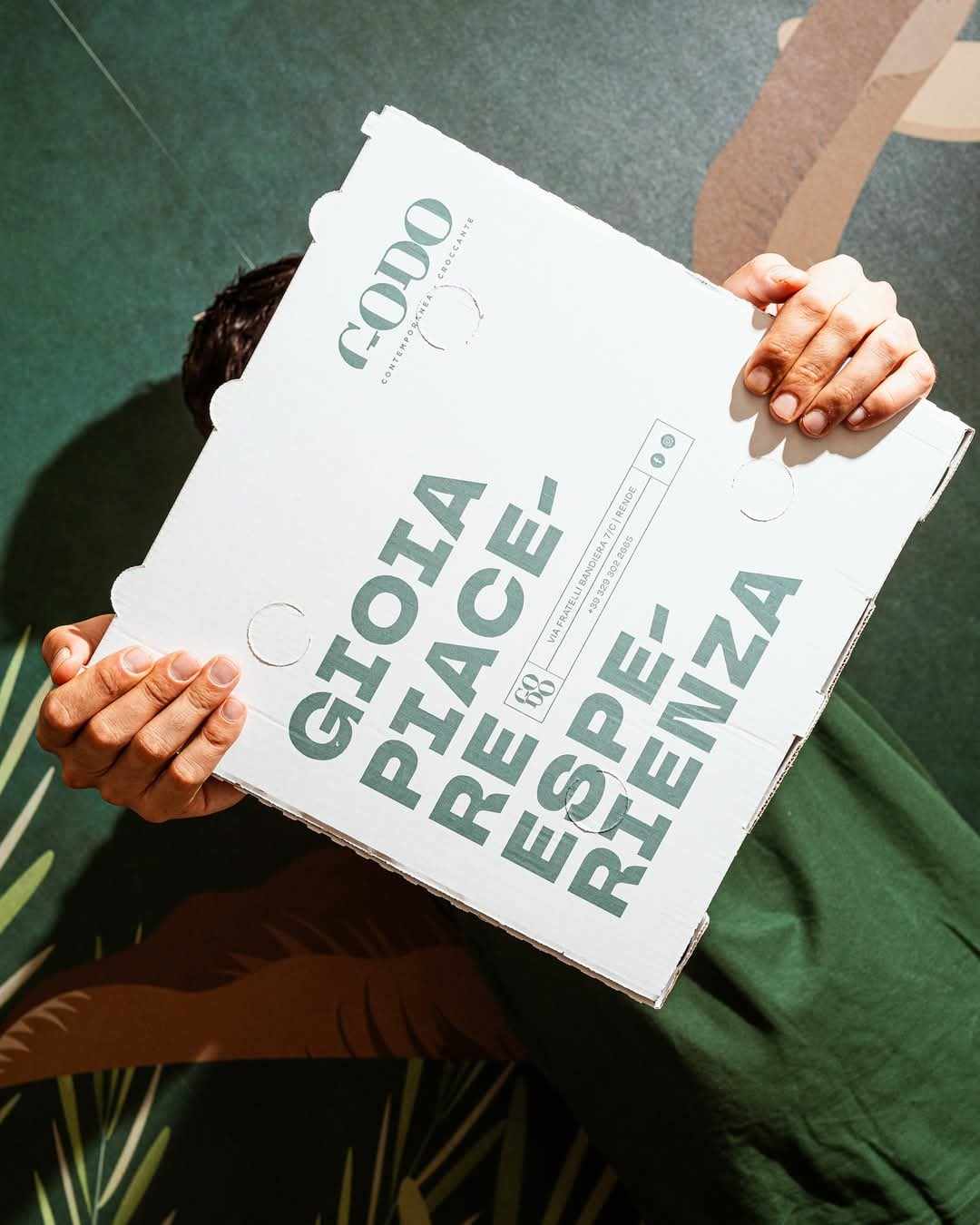 La nostra pizza da Godo di fatto è un ‘ibrido’. Noi siamo sempre stati amanti della pizza in teglia alla romana (infatti è quella che facciamo da Pizzaquadra) ma abbiamo deciso di creare per Godo una pizza rotonda contemporanea, all’aspetto napoletana, ma interamente croccante, con ingredienti di primissima qualità.