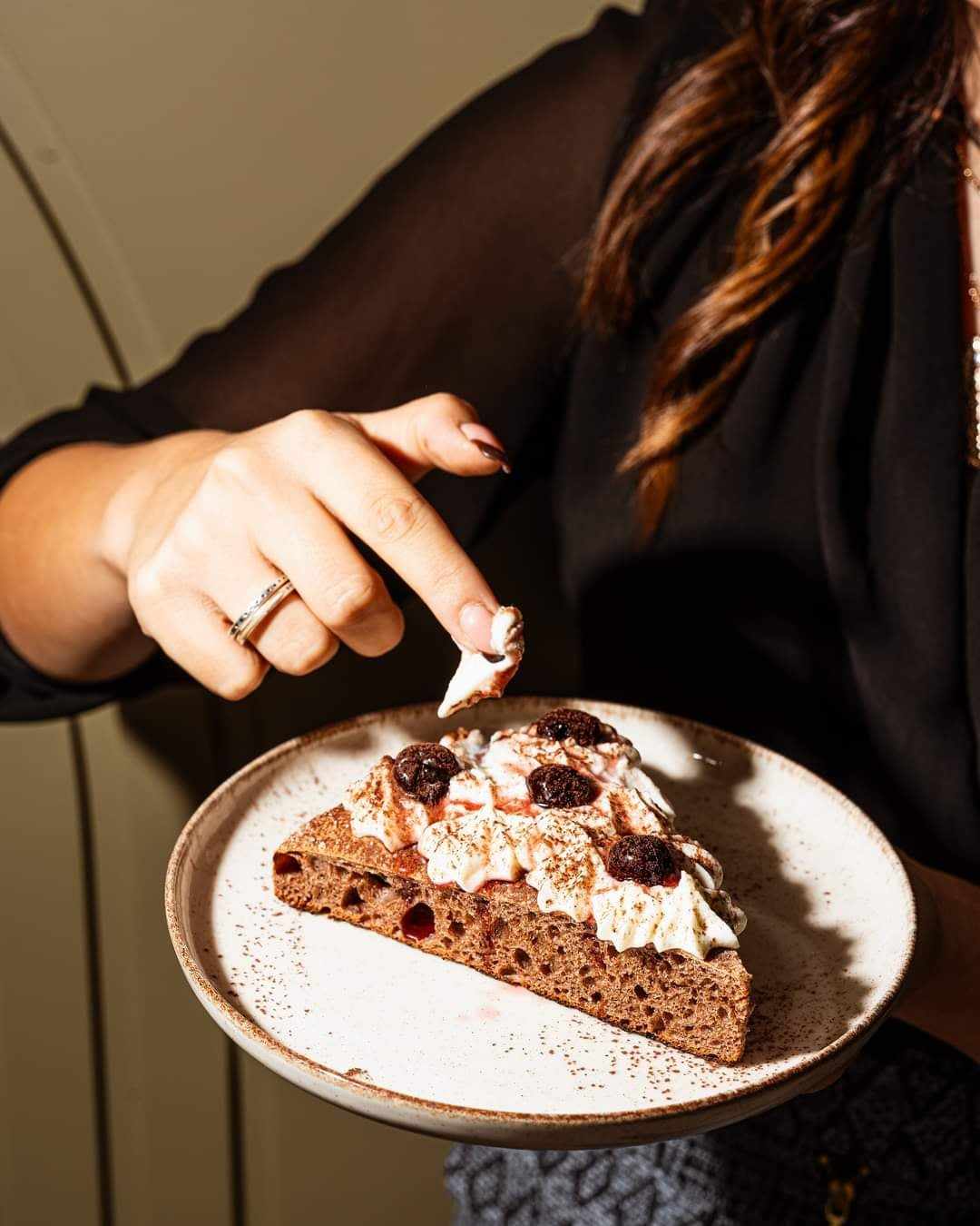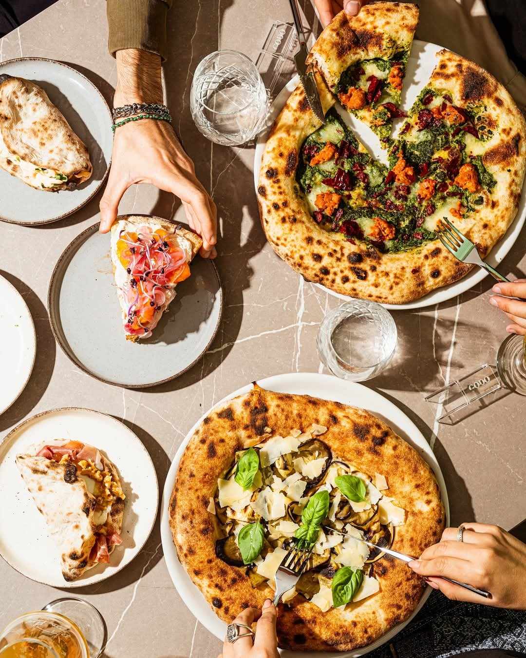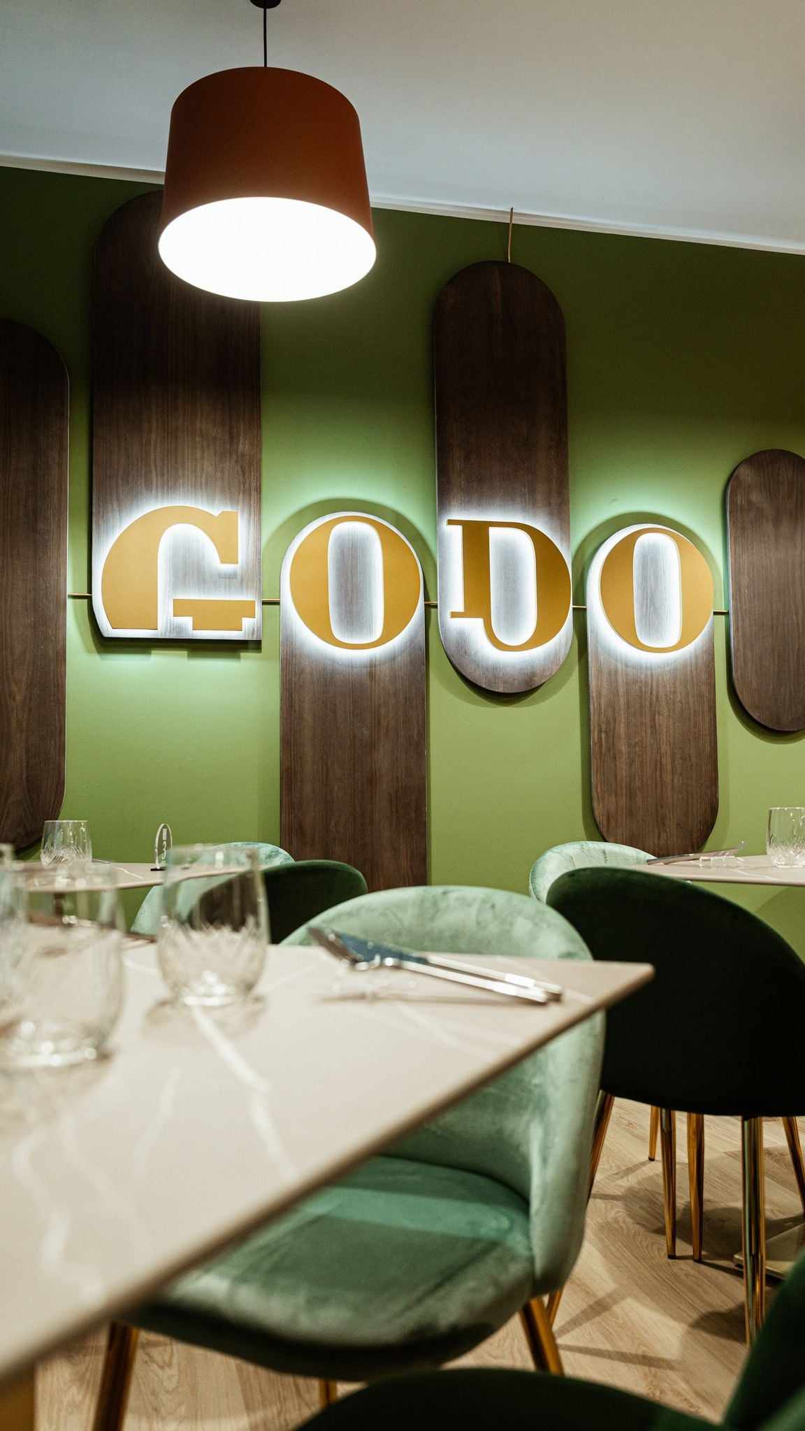 La nostra pizza da Godo di fatto è un ‘ibrido’. Noi siamo sempre stati amanti della pizza in teglia alla romana (infatti è quella che facciamo da Pizzaquadra) ma abbiamo deciso di creare per Godo una pizza rotonda contemporanea, all’aspetto napoletana, ma interamente croccante, con ingredienti di primissima qualità.