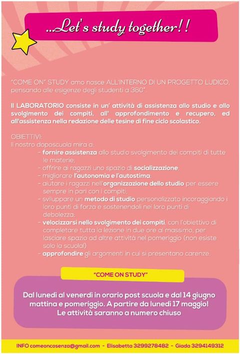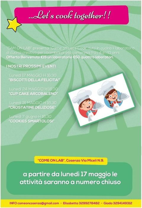 Ha inaugurato ieri a Cosenza “Come on”, che in Via Misasi 99 organizzerà eventi di ogni tipo e per tutte le età… ed in Via Miceli 72 laboratori ludico creativi per bambini e non solo…. (cucina, lettura, cucito, arte e ceramica).