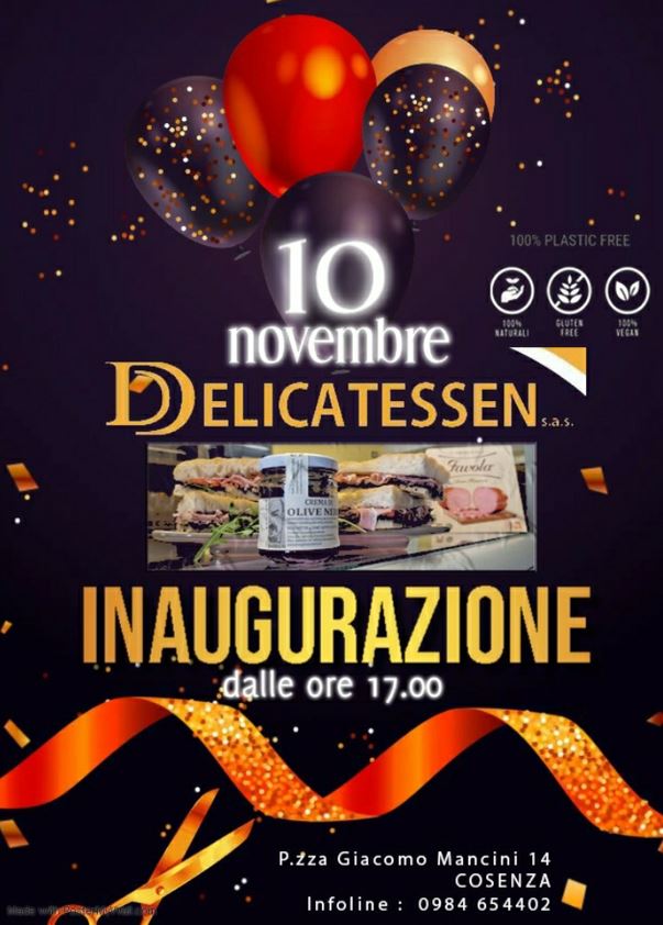 Ha inaugurato oggi, giorno 10 novembre, alle ore 17, in Piazza Giacomo Mancini 14, il negozio “Delicatessen”. Attività che propone ai propri clienti specialità gastronomiche raffinate e ricercate, con particolare attenzione ai prodotti Gluten free.