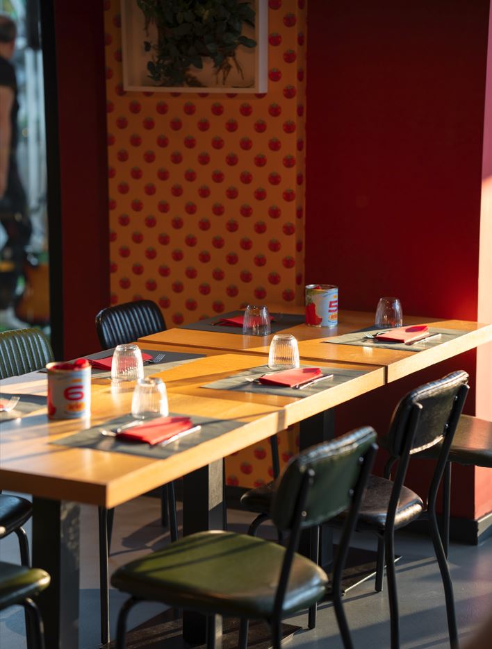 Il concept ruota attorno a un elemento iconico della cucina italiana – il pomodoro – elevato a simbolo della tradizione, della semplicità e della convivialità.