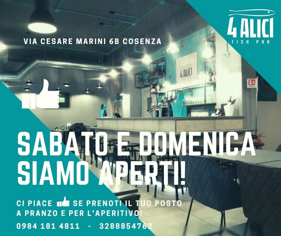 Domani inaugura a Cosenza il nuovo locale “4 Alici Fish pub”, in via Cesare Marini 6b. Il “4 Alici” si presenta per la prima volta ai cittadini, ma ha in realtà alle spalle una lunga esperienza e storia nella città dei bruzi.