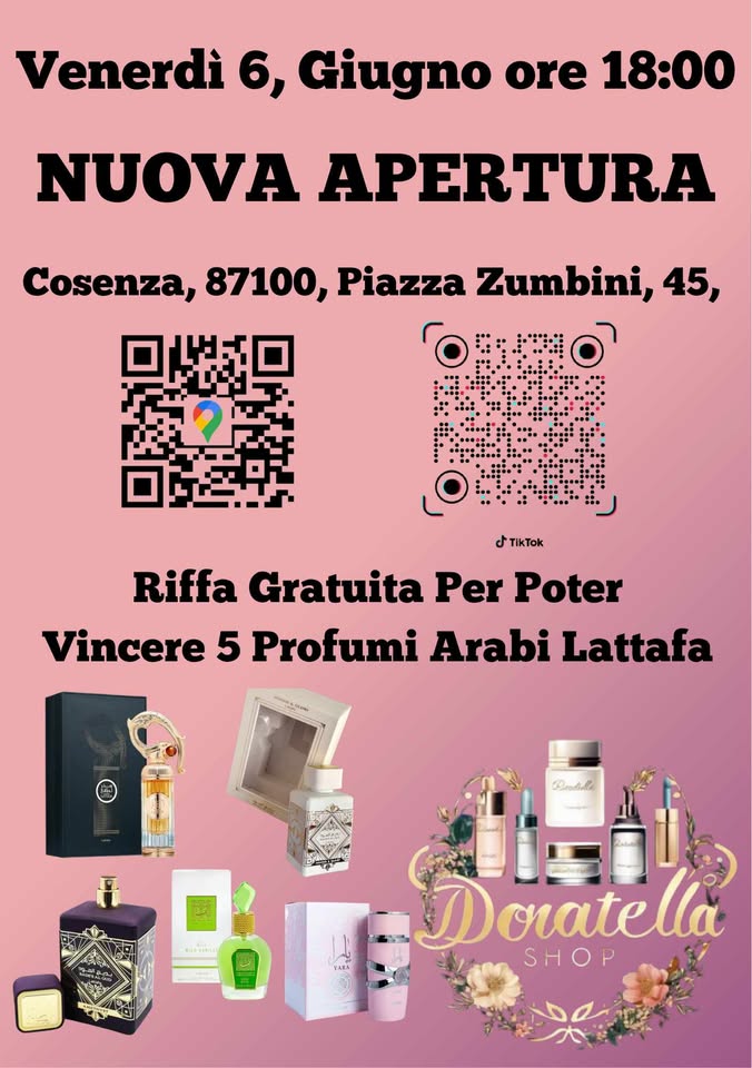 Inaugura questa sera, alle ore 18, a Cosenza in Piazza Zumbini, il negozio “Donatella Shop”. Nell’attività verranno proposti prodotti di cosmetica, profumi, per la cura del corpo e della casa, così come accessori e bijoux.