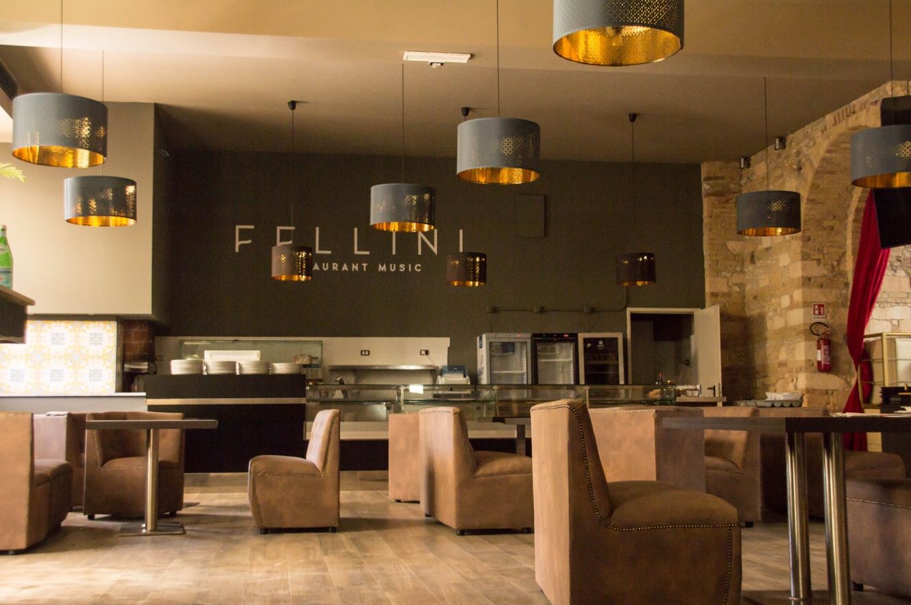 Il Fellini è un luogo magico, arredato da splendide stampe in bianco e nero, che riportano alla vita e alle creazioni del genio romagnolo, vincitore di cinque premi Oscar. Tra le gigantografie che impreziosiscono l’ambiente, c’è anche la scena più iconica del cinema italiano del XX secolo: Anita Ekberg nella Fontana di Trevi, con l’acqua che le arriva quasi ai fianchi, chiama Marcello Mastroianni: “Marcello, come here. Hurry up!”. Cinque parole inglesi che sanno di arte e gusto italiani.