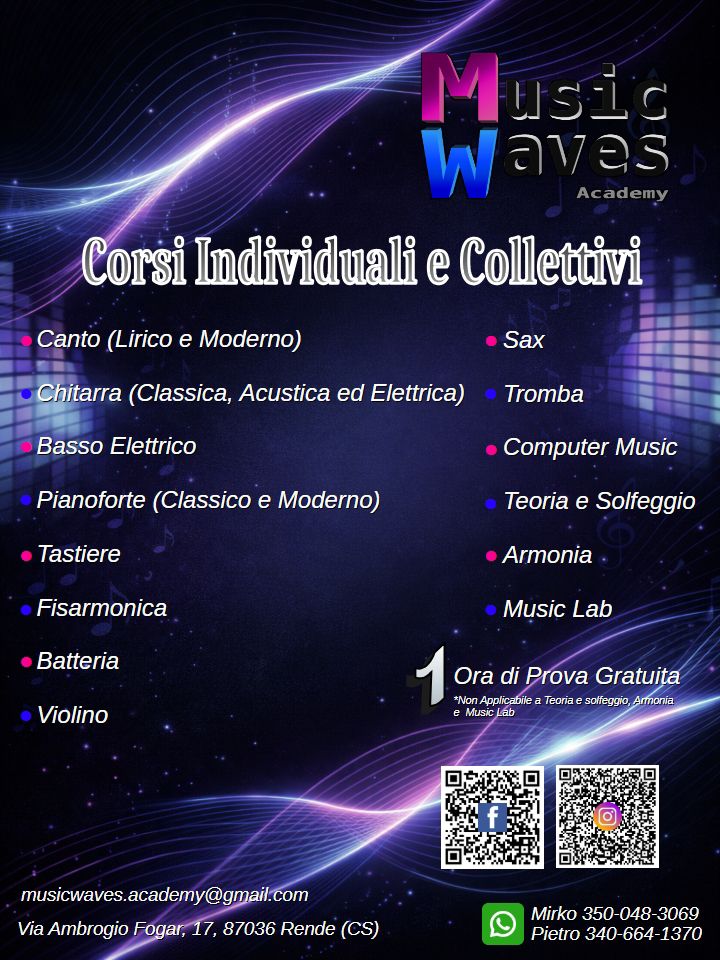 Situata nel cuore della zona industriale di Rende, la Music Waves Academy annuncia la sua apertura affidata ai musicisti Pietro De Rose e Mirko Cannizzaro. Già noti nel panorama artistico come fondatori e direttori della formazione “Senza Fine Live Band”, molto conosciuta e richiesta dal territorio di tutta la provincia, De Rose e Cannizzaro intendono infondere alla struttura un’identità rinnovata, caratterizzata da un approccio dinamico e contemporaneo.