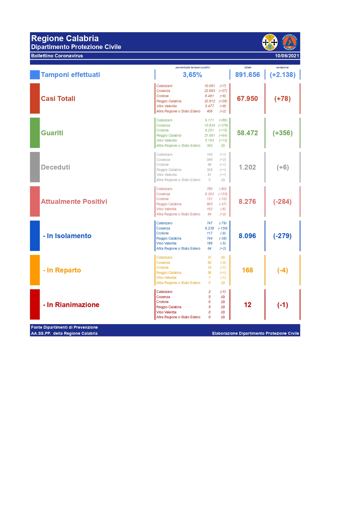 Questo il bollettino con i dati regionali sull’emergenza epidemiologica di Covid-19, diffusi dal dipartimento Tutela della salute della Regione Calabria: