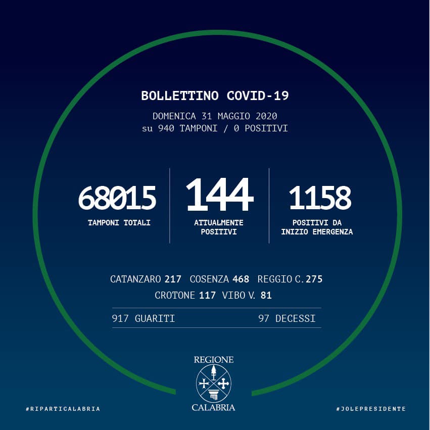 – Reggio Calabria: 20 in isolamento domiciliare; 236 guariti; 19 deceduti.