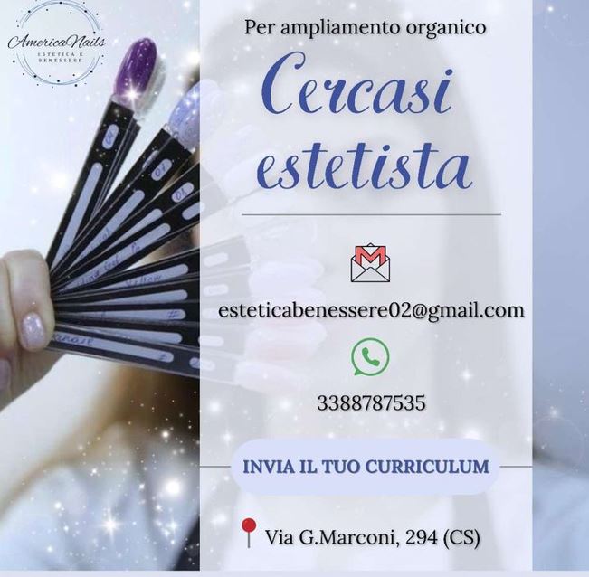 Il Centro estetico “Estetica e benessere“, sito in via G. Marconi 294 a Rende, cerca per ampliamento organico, una figura di estetista full time.