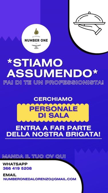 Per candidarsi e fissare un appuntamento conoscitivo, nel quale ricevere tutti i chiarimenti sui turni e orario di lavoro inviare un’email al seguente indirizzo: numberonedalorenzo@gmail.com oppure tramite whatsapp 3664195208.”