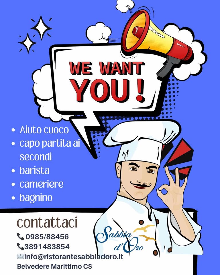 Per informazioni contattaci al 0985/88456 o al 389/1483854 oppure manda il tuo curriculum ad info@ristorantesabbiadoro.it