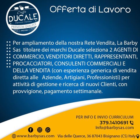 La Barby Sas, titolare del marchio ‘Caffè Ducale’, è alla ricerca di una figura professionale di rappresentanza
