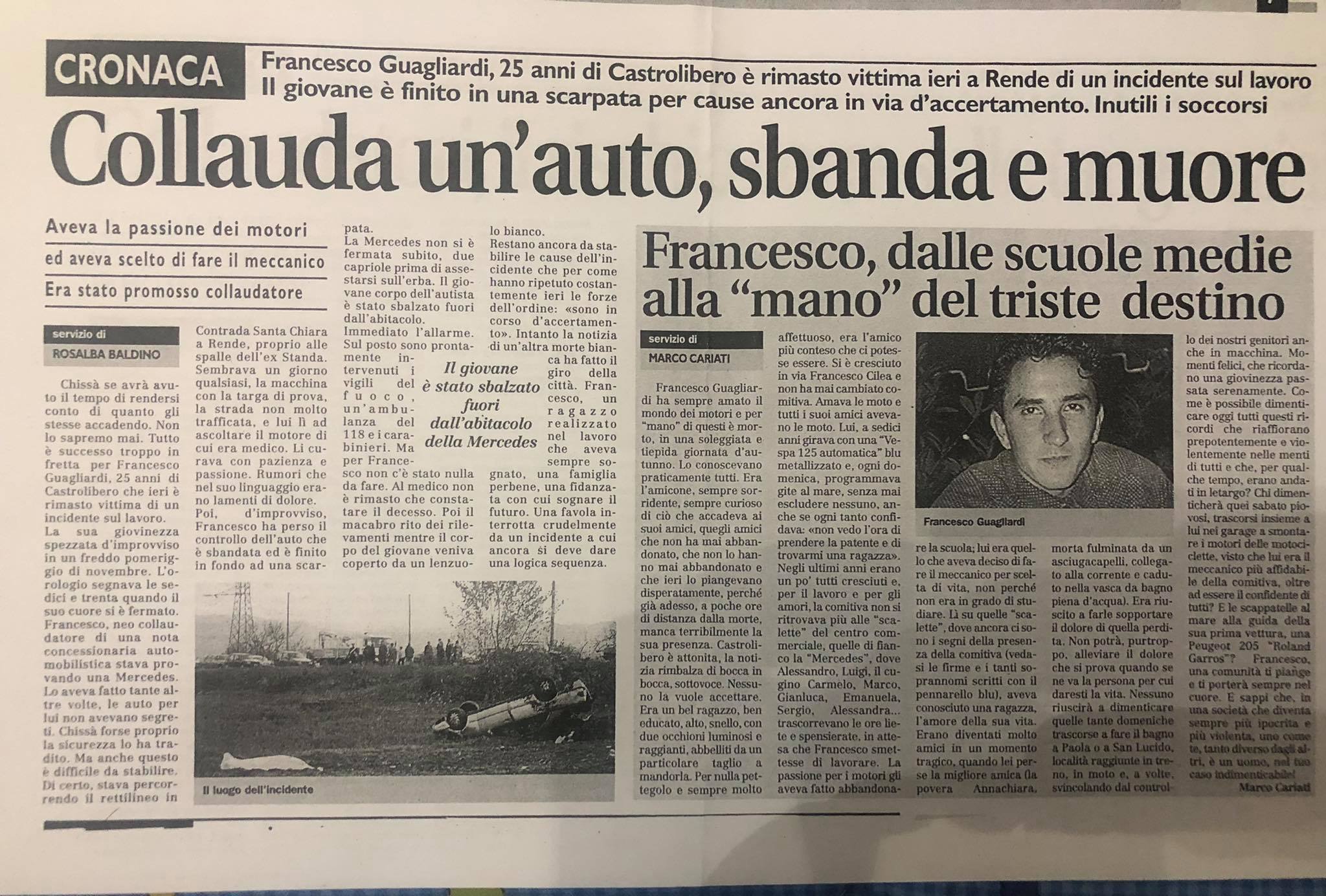 Riceviamo le parole di Cesare, fratello di Francesco Guagliardi di Castrolibero, morto in un incidente stradale il 24 novembre 2000 a Santa Rosa di Rende. Il giovane ragazzo, all’epoca 25enne, era il collaudatore della Mercedes e stava provando una macchina quando è tragicamente finito fuori strada…