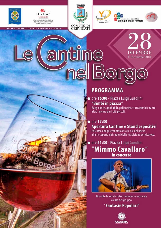 Alle 17:30 si darà avvio al percorso con l’apertura degli stand e delle Cantine. E novità di quest’anno, a partire dalle 21:30, la musica popolare calabrese risuonerà in Piazza Guzolini con il concerto del grande artista Mimmo Cavallaro.