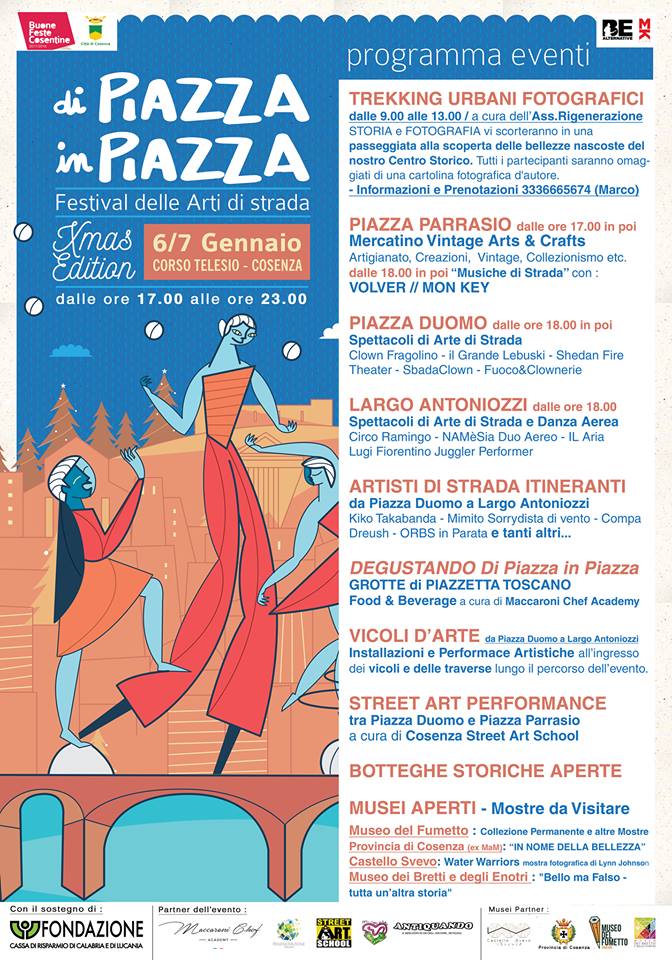 “Il centro storico della città di Cosenza nelle giornate di sabato 6 e domenica 7 gennaio diverrà nuovamente quinta naturale degli spettacoli della manifestazione “Di Piazza in Piazza – Xmas Edition”.
