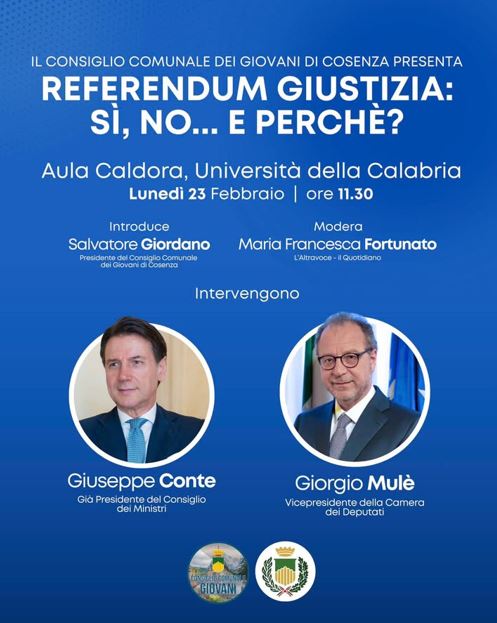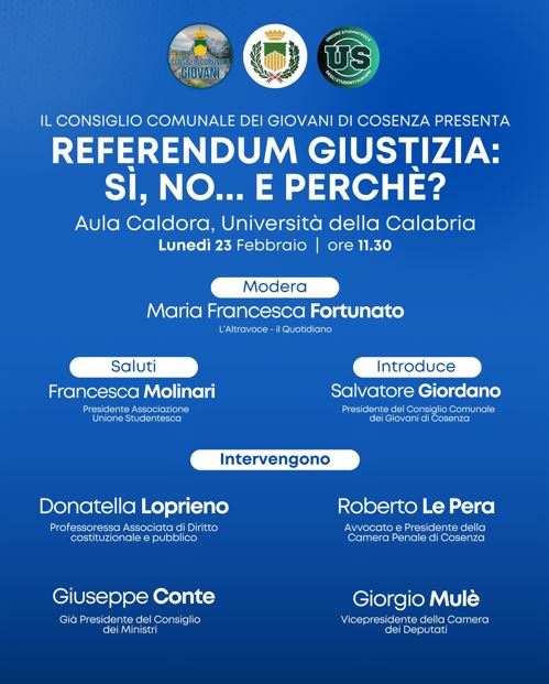 Il Consiglio Comunale dei Giovani di Cosenza presenta l’incontro “Referendum sulla Giustizia: sì, no… e perché?”, in programma oggi lunedì 23 febbraio alle ore 11:30 presso l’Aula Caldora dell’Università della Calabria