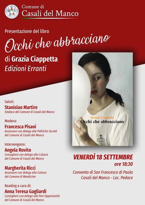 Questa sera alle ore 18:30 nel convento di San Francesco di Paola a Pedace, Casali del Manco, la nostra lettrice Grazia Ciappetta presenterà il suo libro “Occhi che abbracciano”.
