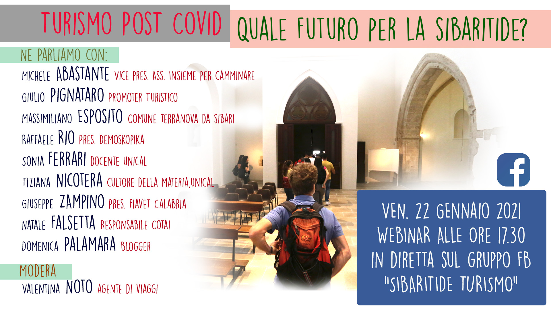 Il seminario web si terrà in diretta Facebook venerdì 22 Gennaio 2021 alle ore 17.30 all’interno del Gruppo pubblico Sibaritide Turismo https://bit.ly/2XYuO8J.