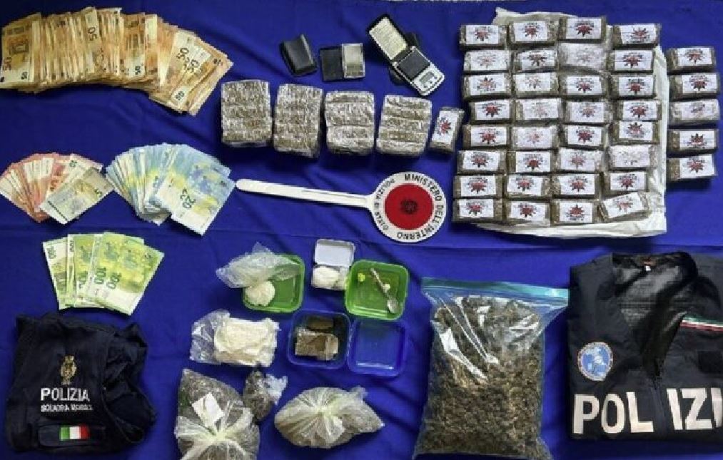 “Nel corso dell’attività di P.G., è stato rinvenuto, in un fondo agricolo a libero accesso, prospiciente la medesima via, sostanza stupefacente del tipo marijuana per un peso complessivo di grammi 900, cocaina per grammi 249, hashish per un peso totale di 5.700 grammi ed un pacchetto contenente denaro contante, di diverso taglio, per un totale di euro 20.030,00, il tutto diversamente confezionato e custodito in una busta per la spesa.”