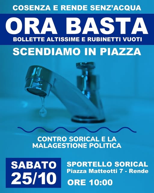 Domani invitiamo i cittadini e le cittadine a ritrovarsi in piazza Matteotti a Rende, nei pressi della sede Sorical della provincia di Cosenza. Prendiamo parola per difendere un diritto essenziale, per chiedere trasparenza, investimenti e rispetto».